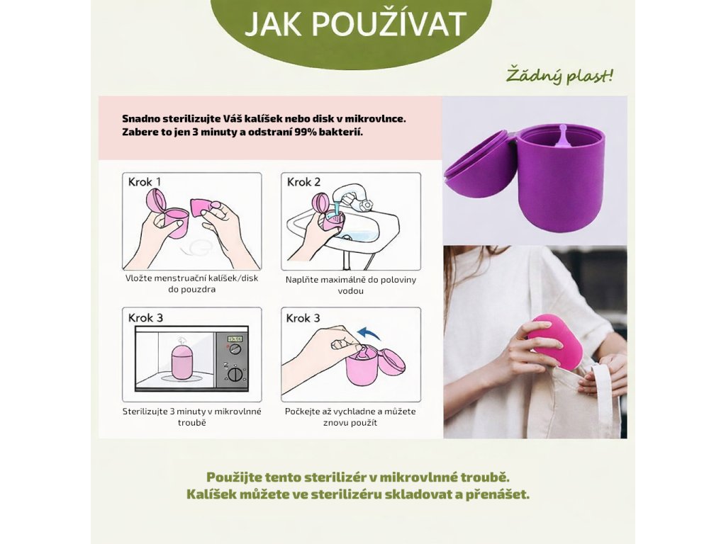 Součástí sady je silikonový sterilizér na menstruační kalíšky i disky, který umožňuje rychlou a bezpečnou sterilizaci v mikrovlnné troubě (cca 2–3 minuty). Vyroben ze 100% lékařského silikonu, bez BPA a plastů.