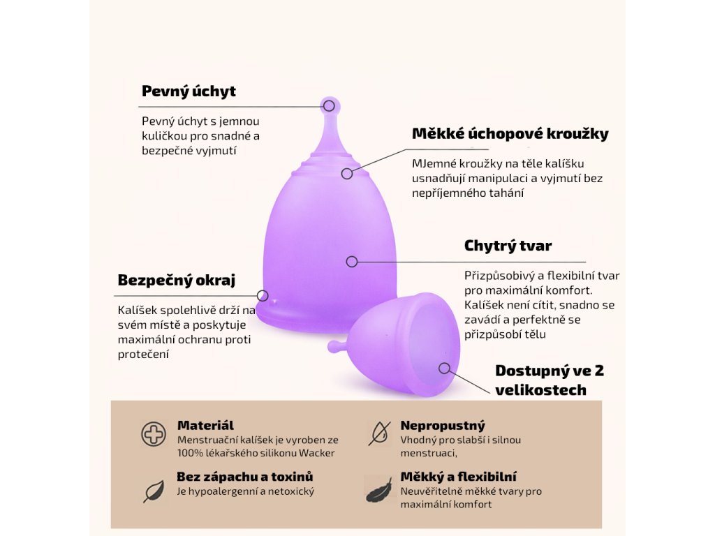 Kalíšek je vyroben ze 100% vysoce kvalitního lékařského silikonu Wacker (Germany) – hypoalergenního, netoxického a bez zápachu. Je šetrný k tělu, vhodný i pro citlivé ženy a určený k dlouhodobému používání.